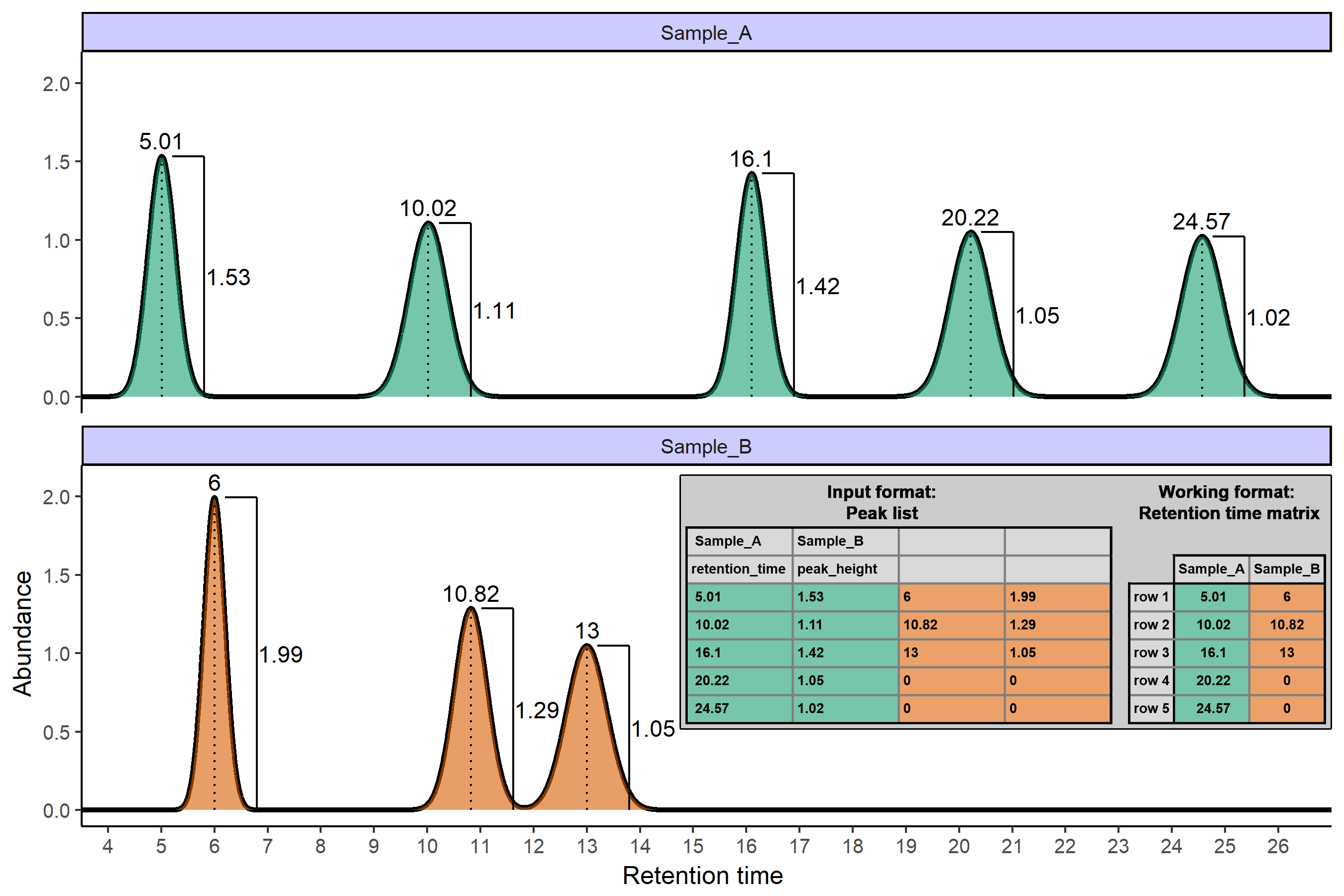 GCalignR provides simple functions to align peak lists obtained from Gas Chromatography Flame Ionization Detectors (GC-FID) based on retention times and plots to evaluate the quality of the alignment. The package supports any other one-dimensional chromatography technique that enables the user to create a peak list with at least one column specifying retention times as illustrated below.