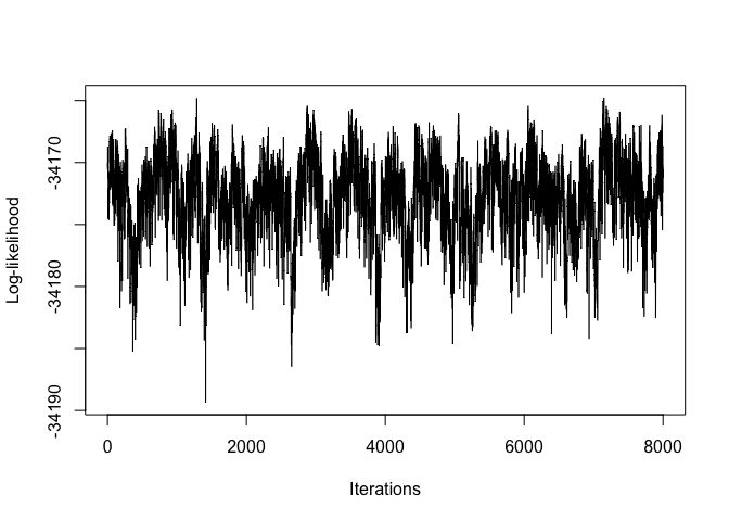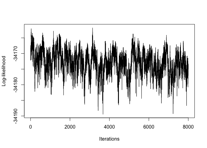 plot(Output1$LLPst, type = 'l', xlab = "Iterations", ylab = "Log-likelihood")