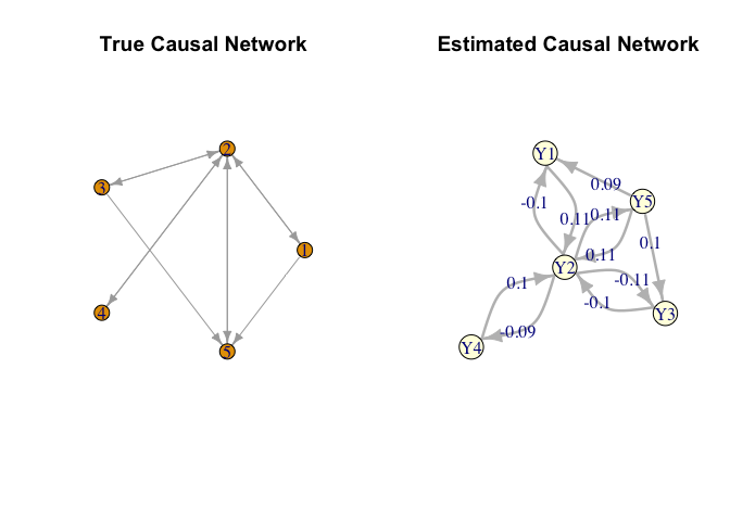 D = D, n = 10000, prior = "Spike and Slab")We get the estimated causal interaction matrix between response variables in the following way: