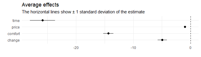 The following lines fit a probit model that explains the chosen trip alternatives (choice) by their price, time, number of changes, and level of comfort (the lower this value the higher the comfort). For normalization, the price coefficient is fixed to -1, which allows to interpret the other coefficients as monetary values: