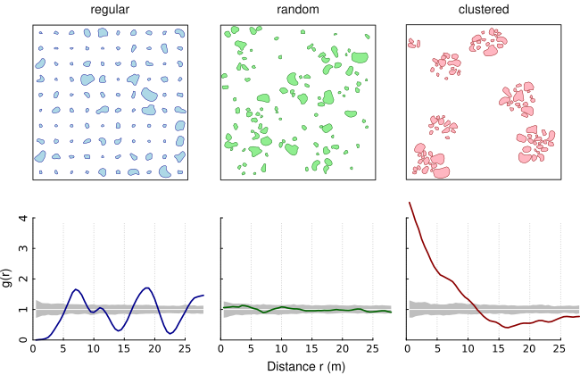 The following figure shows three simulated patterns (regular, random, clustered; from Nuske et al. 2009) to demonstrate the behavior of the PCF in three extreme cases (colored line: estimated function; white line: theoretical value of the function under the null hypothesis of complete spatial randomness; grey area: 95% confidence envelope under the null hypothesis, computed by Monte Carlo simulation using 199 replicates). Under complete spatial randomness (CSR), g(r) = 1. Values g(r) < 1 suggest inhibition between objects and values g(r) > 1 suggest clustering.