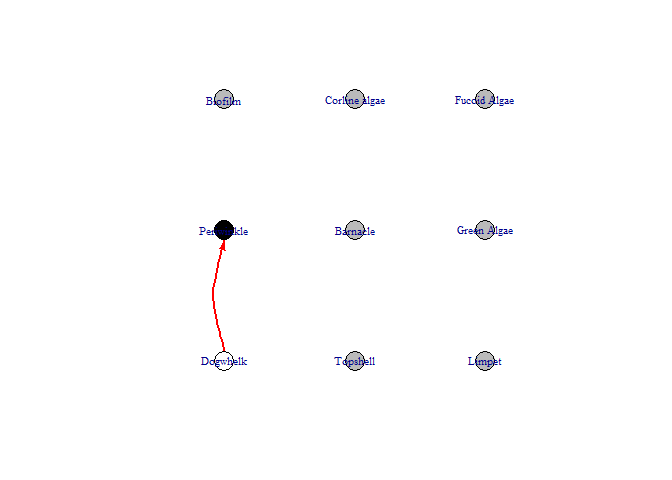 #> 9 0.3597076 Fucoid Algae 0.3597076 0.3597076The output given above shows the posterior outcome of the model as a result of dogwhelks decreasing - under the Increase column. Grazers increase (positive values) and some of the seaweeds which would be grazed by the grazers decreases. As the paper above explains, this is a short-term prediction model, so some seaweed actually increases in this scenario. There are also confidence intervals of our predictions - currently these show no difference to the main values, but we can bootstrap the model to gain an idea of the confidence of the predictions.