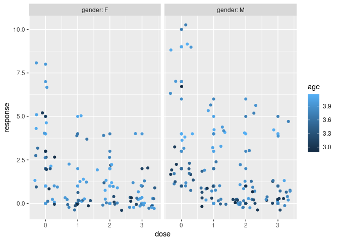 We begin with an example where we simulate negative binomial data where age and gender are prognostic factors. In this example, males have higher counts than females and older individual have higher counts than younger people.