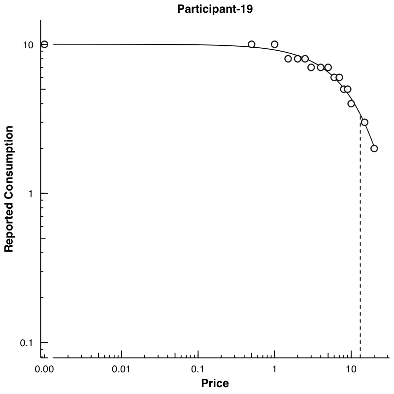 An example dataset of responses on an Alcohol Purchase Task is provided. This object is called apt and is located within the beezdemand package. These data are a subset of from the paper by Kaplan & Reed (2018). Participants (id) reported the number of alcoholic drinks (y) they would be willing to purchase and consume at various prices (x; USD). Note the format of the data, which is called “long format”. Long format data are data structured such that repeated observations are stacked in multiple rows, rather than across columns. First, take a look at an extract of the dataset apt, where I’ve subsetted rows 1 through 10 and 17 through 26: