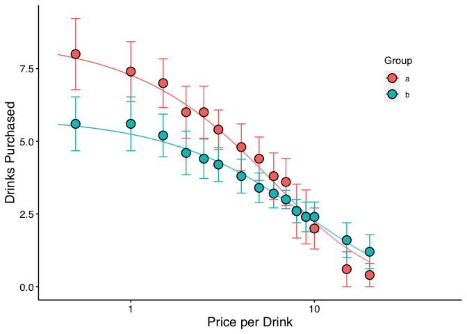 When verbose = TRUE, objects from the result can be used in subsequent graphing. The following code generates a plot of our two groups. We can use the predicted values already generated from the ExtraF function by accessing the newdat object. In the example above, we can access these predicted values using ef$newdat. Note that we keep the linear scaling of y given we used Koffarnus et al. (2015)’s equation fitted to the data.