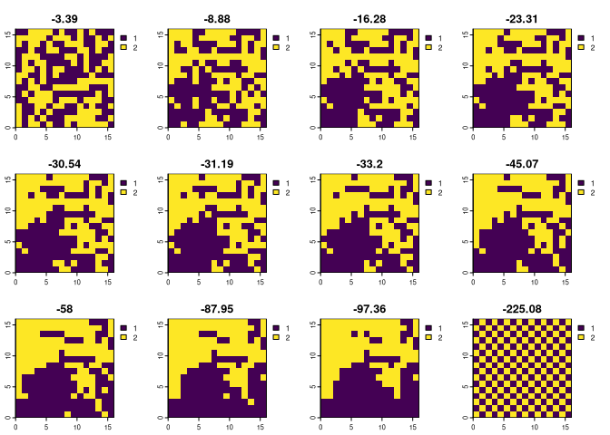 Let’s start by attaching relevant packages and reading example data mosaic. This dataset contains 12 raster layers, where each has an equal number of cells with values 1 and 2 (identical compositions), but they are differently arranged in space (different configurations).