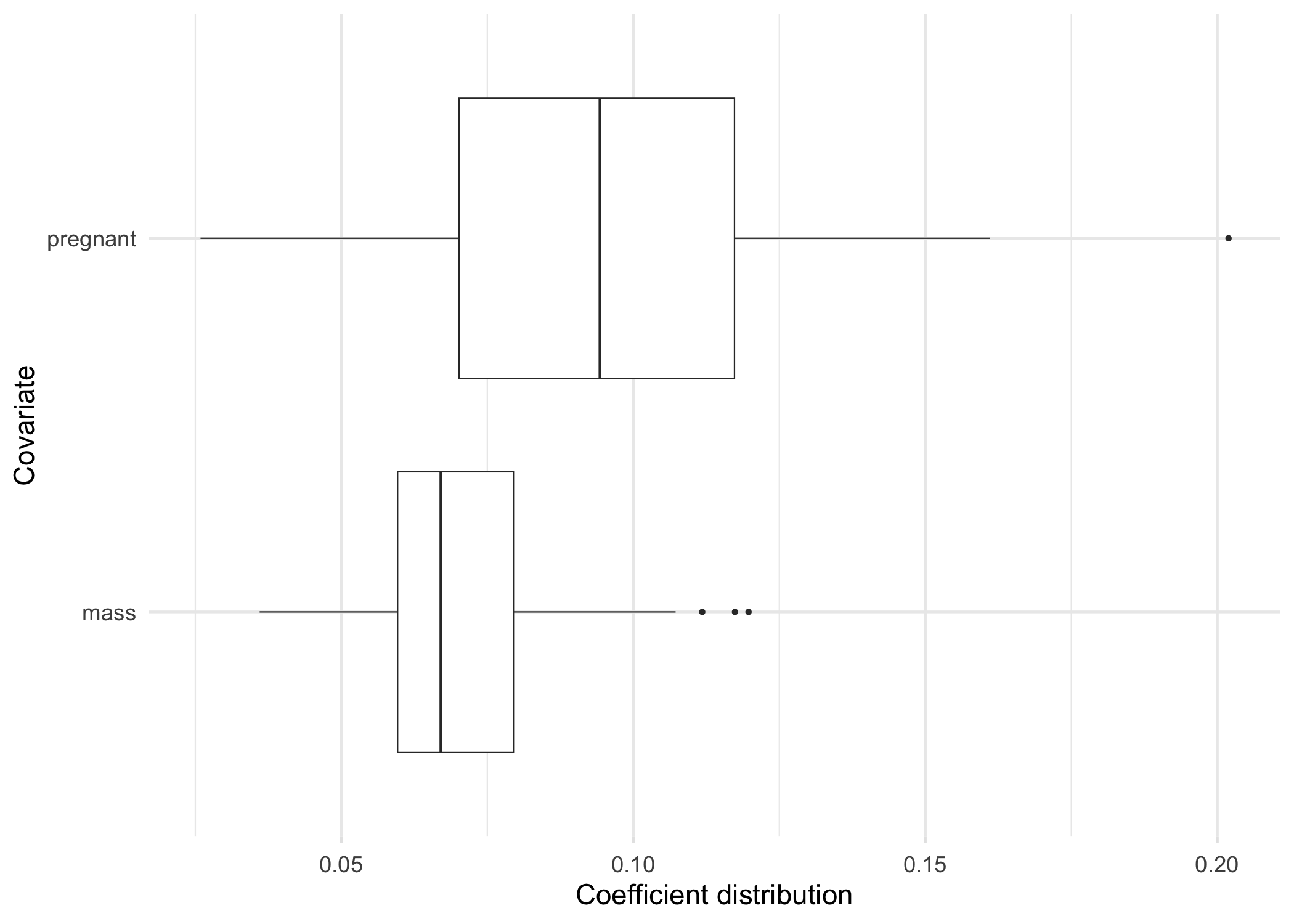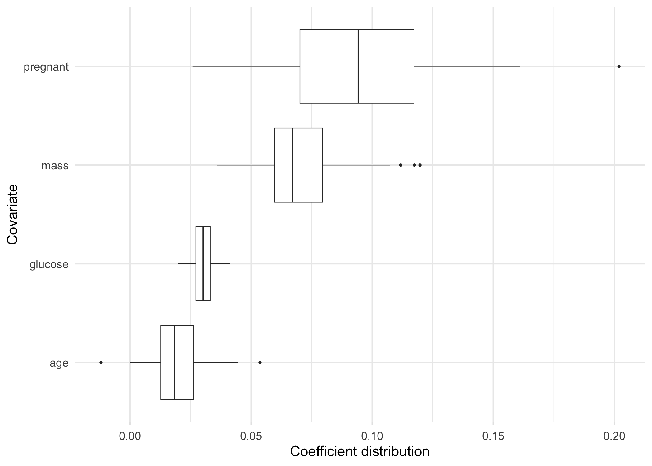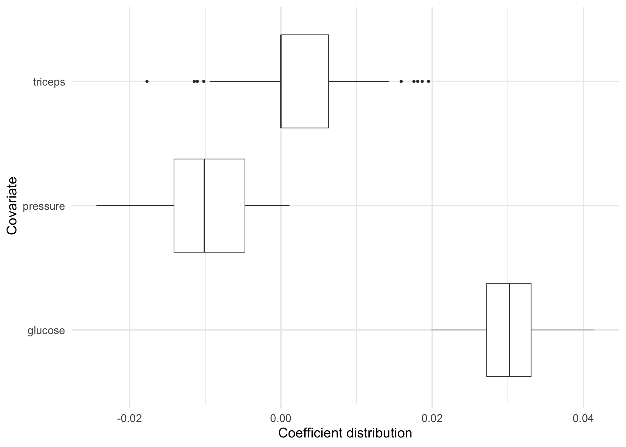 #> 16 triceps VIP 0.69 0.31 4bolasso also supports moving beyond variable selection and understanding the bootstrapped variable coefficients. We can extract a tidy tibble where each variable is a column, and each row represents a bootstrap fold, and the values are the corresponding estimated coefficients.