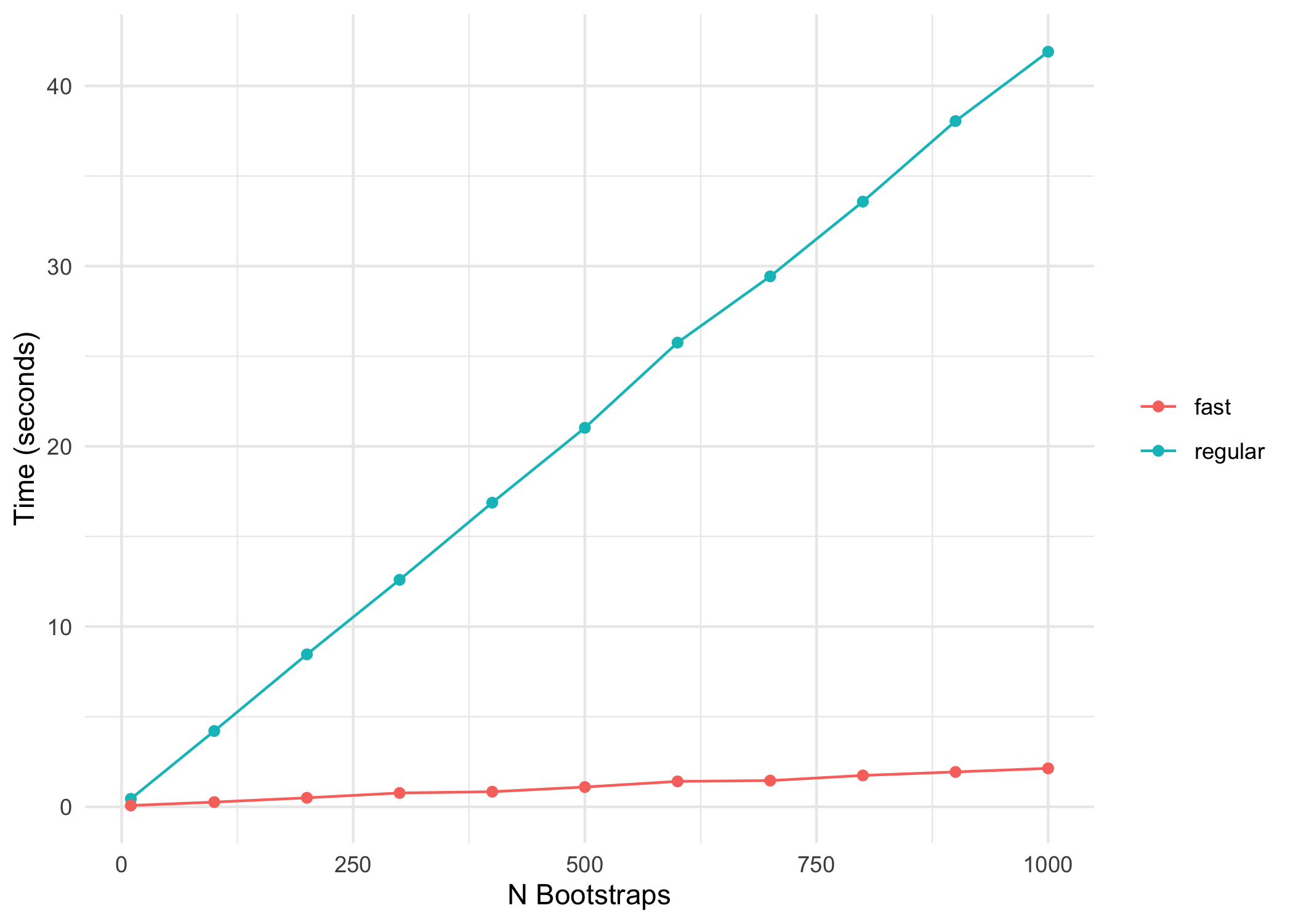 labs(x = "N Bootstraps", y = "Time (seconds)") +