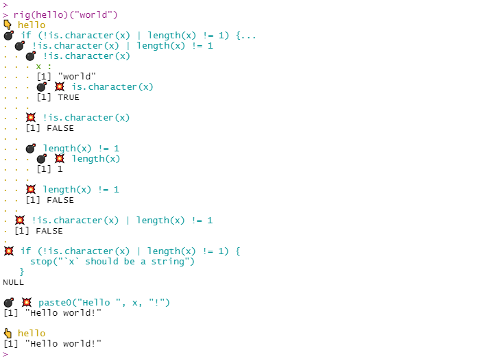 The {boomer} package provides debugging tools that let you inspect the intermediate results of a call. The output looks as if we explode a call into its parts hence the name.