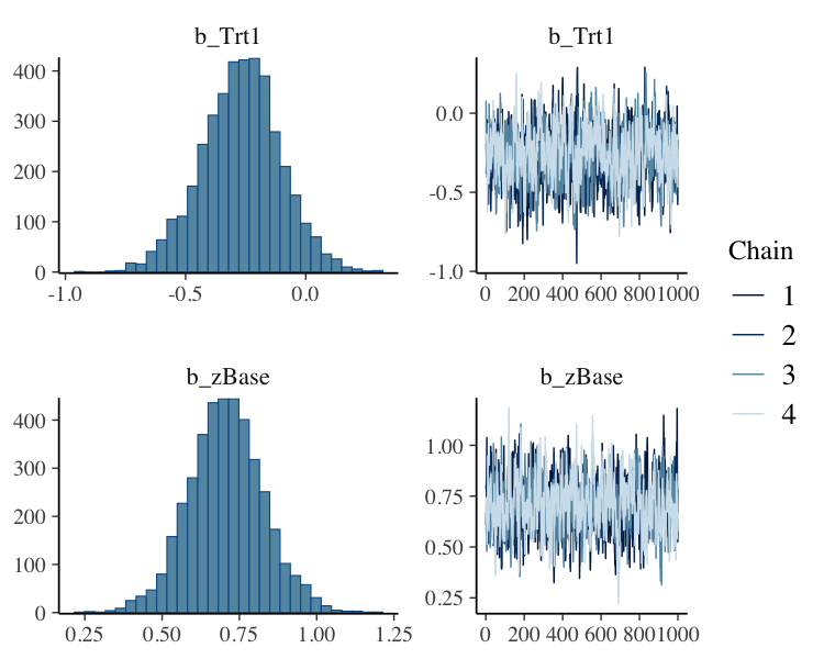 In general, every parameter is summarized using the mean (‘Estimate’) and the standard deviation (‘Est.Error’) of the posterior distribution as well as two-sided 95% credible intervals (‘l-95% CI’ and ‘u-95% CI’) based on quantiles. We see that the coefficient of Trt is negative with a zero overlapping 95%-CI. This indicates that, on average, the treatment may reduce seizure counts by some amount but the evidence based on the data and applied model is not very strong and still insufficient by standard decision rules. Further, we find little evidence that the treatment effect varies with the baseline number of seizures.