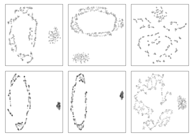 tSNE (t-distributed Stochastic Neighbor Embedding) and UMAP (Uniform Manifold Approximation and Projection) representations of mobius_clust_data are shown below.