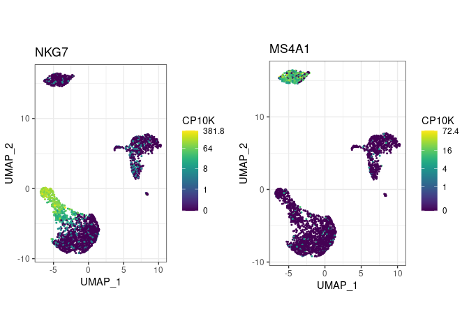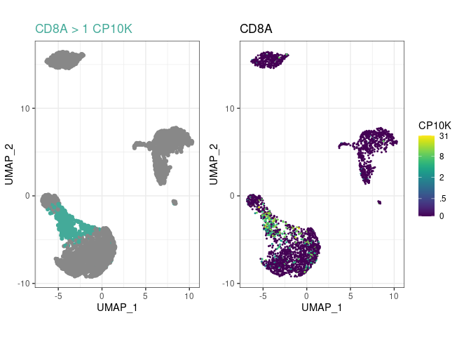 size parameter of 100 in R’s pnbinom), as recommended by Lause, Berens and Kobak (Genome Biology 2021).K.K with the user-provided threshold t, because the sum across NB random variables is again an NB random variable.K are likely to have come from an NB distribution with rate parameter t*S, where t is the CP10K threshold supplied through the rule function, and S is the sum of totalUMI counts from the cell and its neighbors. If it is very likely, the counts are too close to the threshold to decide and the cell is left unassigned. If K lies above the expectancy t*S, the cell is marked as positive, if below, it is marked as negative for the given marker gene.t is chosen such that it separates positive from negative cells, so will typically lie directly between these two populations. This means that the above procedure should not be considered a hypothesis test, because t is picked deliberately to make the null hypothesis (H0: K came from Pois(t*S)) unlikely.t. If cells were sequenced deeply, S becomes larger, which means we have more information to decide.The following has a short demo of every function. Let’s say you have completed the Seurat pbmc2700 tutorial (or it’s shortcut), then you can start pyping from this pbmc object: