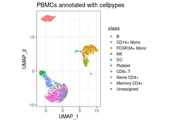 class_to_deseq2: Create DESeq2 object for a given cell typepseudobulk: Form pseudobulks from single-cellspseudobulk_id: Generate unique IDs to identify pseudobulksHere, we annotate the same PBMC data set as in the popular Seurat tutorial, using the Seurat object seurat_object that comes out of it.