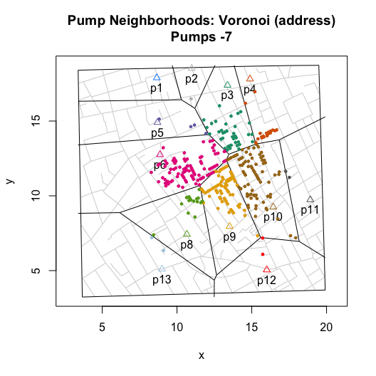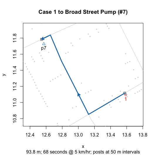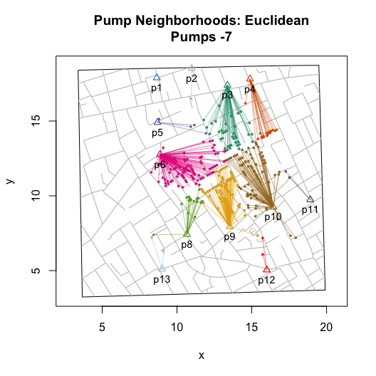 I then wrote functions that compute and visualize walking distances on the map. The value of these functions go beyond the ability to replicate and validate Snow’s efforts. By allowing you to compute hypothetical neighborhoods via selective inclusion or exclusion of pumps or to allow for different measures of proximity (e.g., Euclidean), they also allow you to explore counterfactual scenarios. Ultimately, this can help us to better assess whether we really can use the map to “prove” Snow’s claims.
