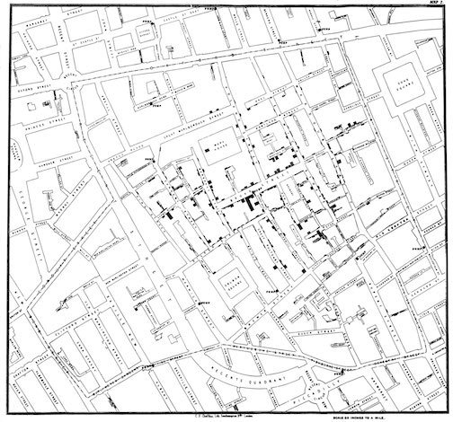remotes::install_github("lindbrook/cholera", build_vignettes = TRUE)John Snow’s map, published in his On The Mode Of Communication Of Cholera, of the 1854 cholera outbreak in London is one of the best known examples of data visualization and information design: