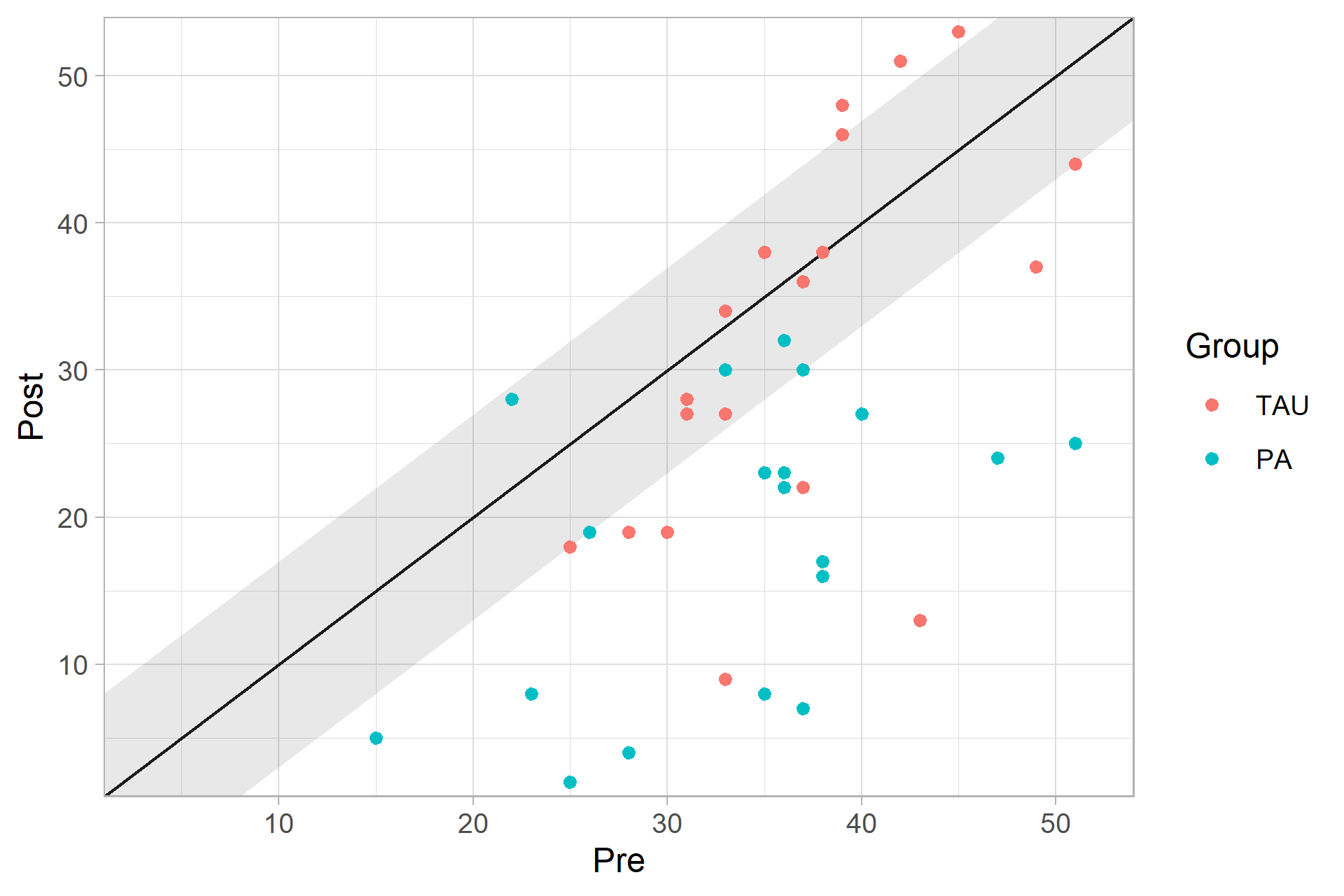 Claus et al. (2020) implemented a novel intervention to enhance the effectiveness of antidepressants by boosting the inherent placebo effect of that medication. The randomized patients to treatment as usual (TAU) and a placebo amplification (PA) group and measured the severity of depressive symptoms over time.