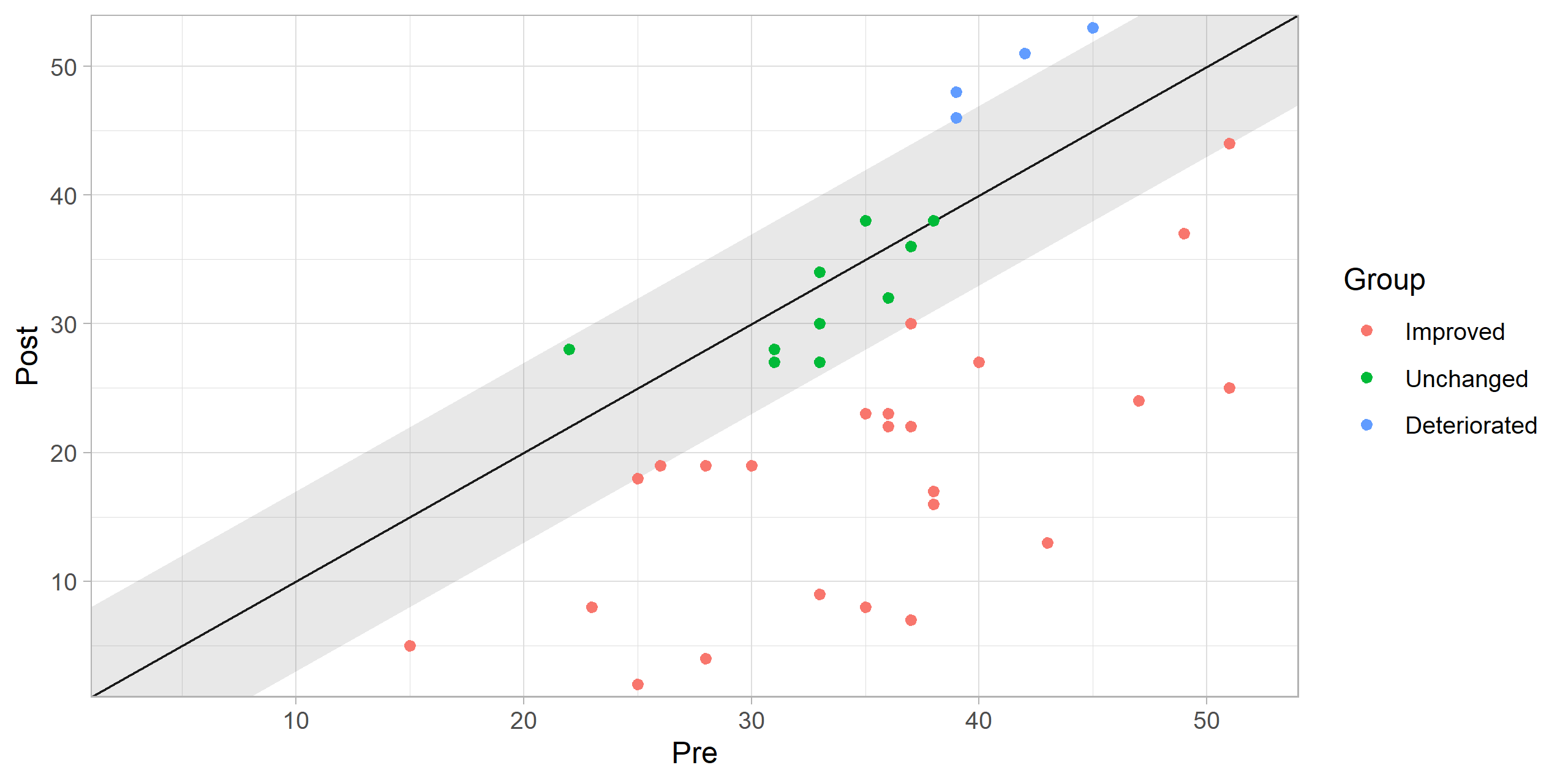 #> decrease in instrument scores (bdi) indicating a clinical significant