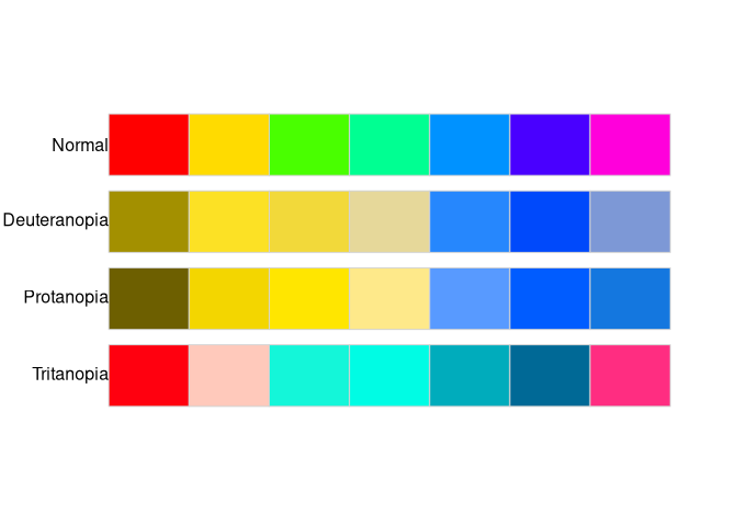 deuteranopia, protanopia, and tritanopia.The work in this package was inspired by a blog post I wrote some code that automatically checks visualizations for non-colorblind safe colors. Here’s how it works by Gregor Aisch.