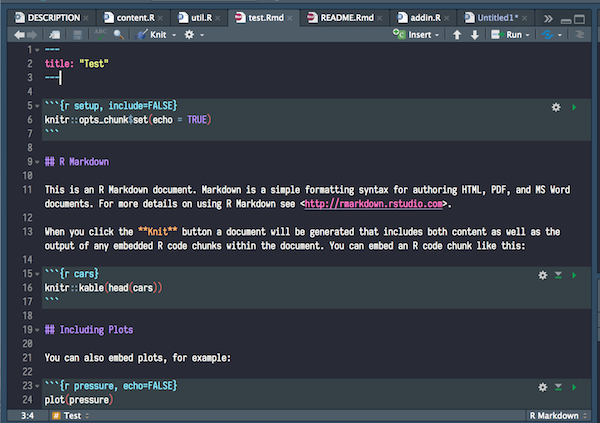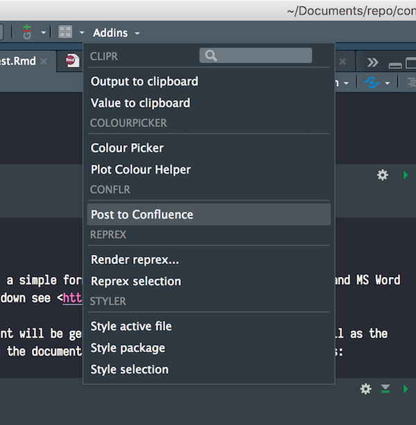 1. Move focus to the .Rmd file and click “Post to Confluence” Addin