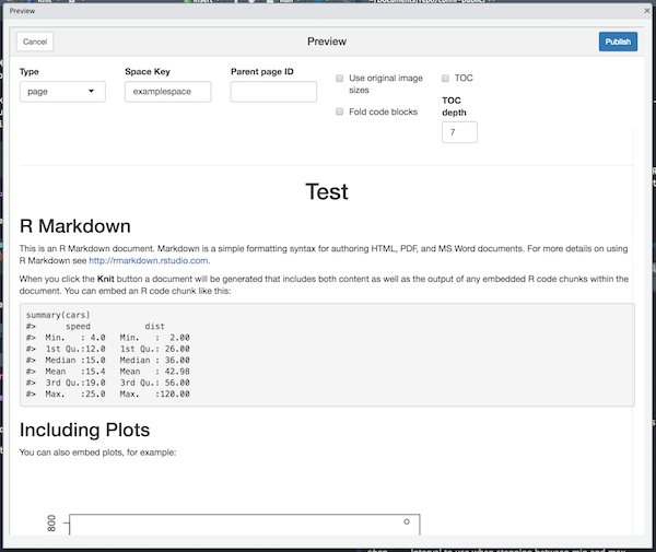 (Caution for those who are not familiar with R Markdown: R Markdown’s powerfulness allows you to execute arbitrary code; be sure about what the code does before clicking “Post to Confluence”!)