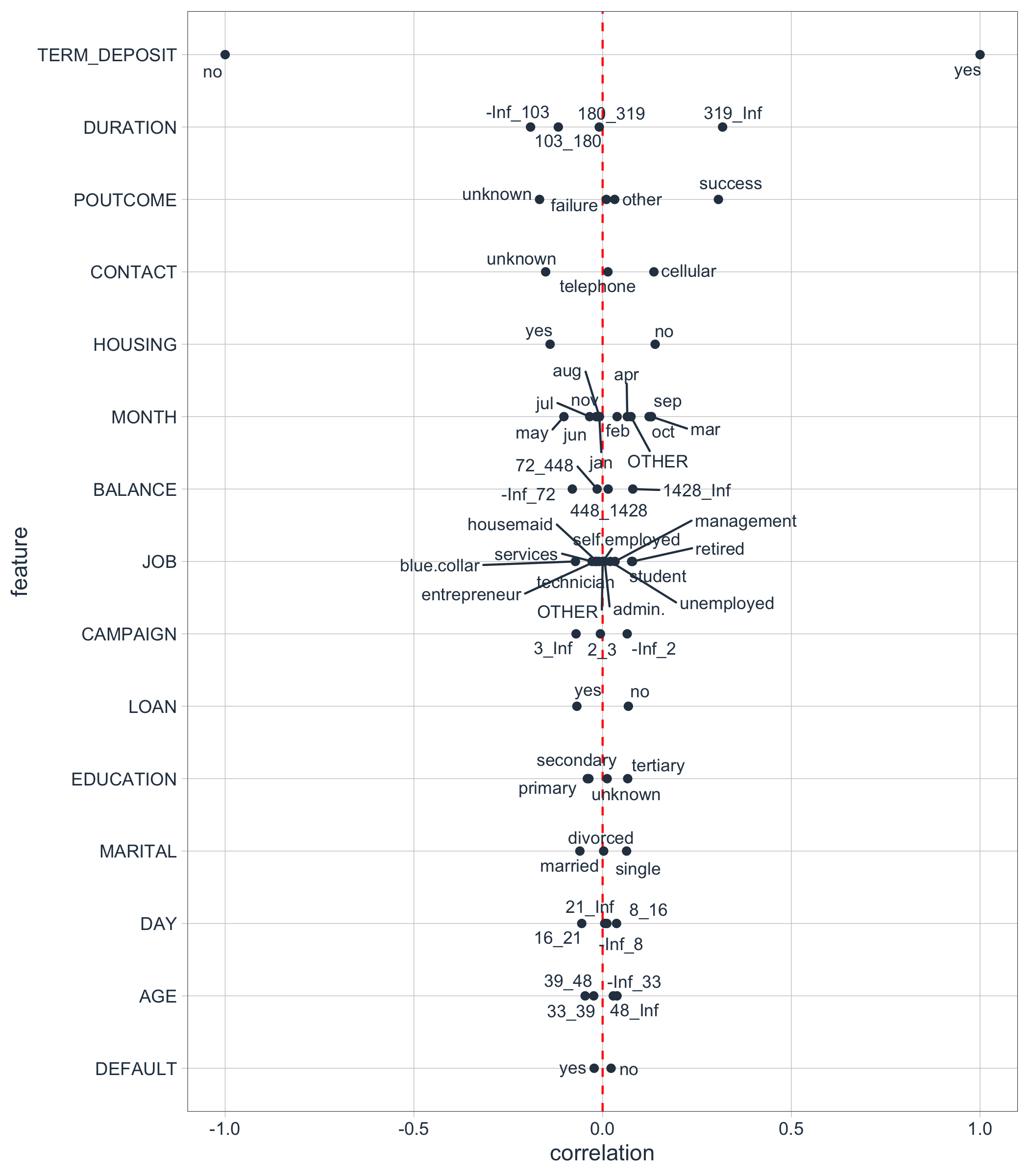 The following example showcases the power of fast exploratory correlation analysis. The goal of the analysis is to determine which features relate to the bank’s marketing campaign goal of having customers opt into a TERM DEPOSIT (financial product).