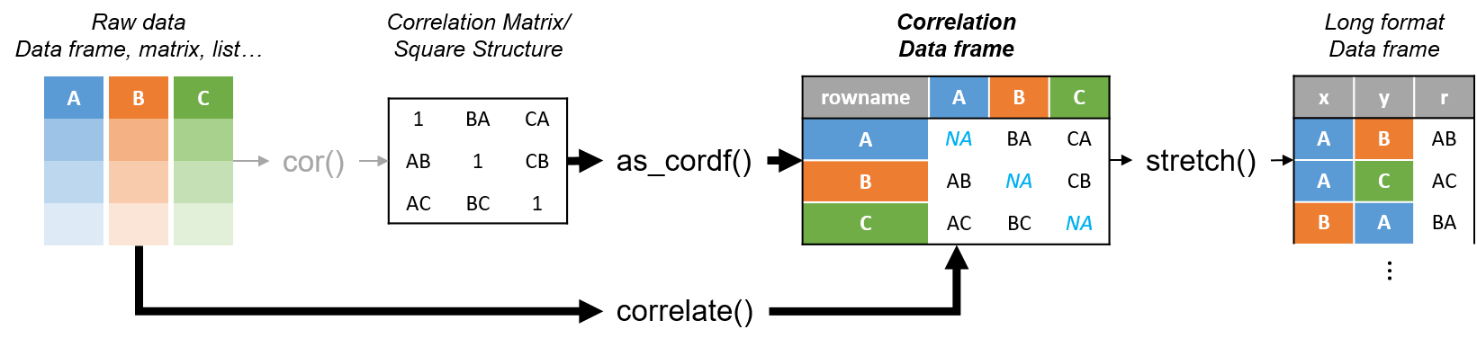 corrr is a package for exploring correlations in R. It focuses on creating and working with data frames of correlations (instead of matrices) that can be easily explored via corrr functions or by leveraging tools like those in the tidyverse. This, along with the primary corrr functions, is represented below: