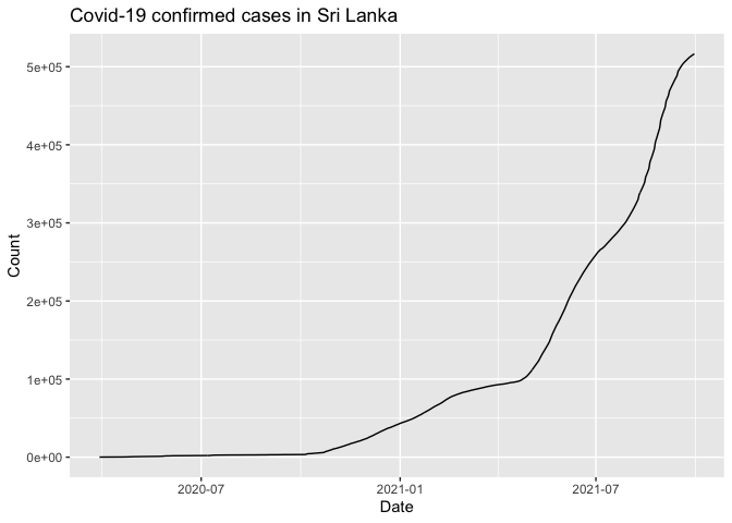 covid.cases %>% filter(Type=="Confirmed") %>% ggplot(aes(x=Date, y=Count)) + geom_line() + ggtitle("Covid-19 confirmed cases in Sri Lanka")