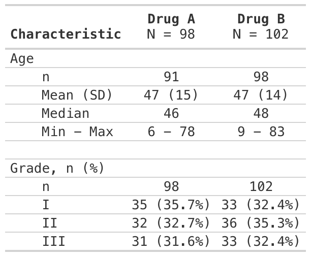 tbl_demographics(by = trt, include = c(age, grade)) |>