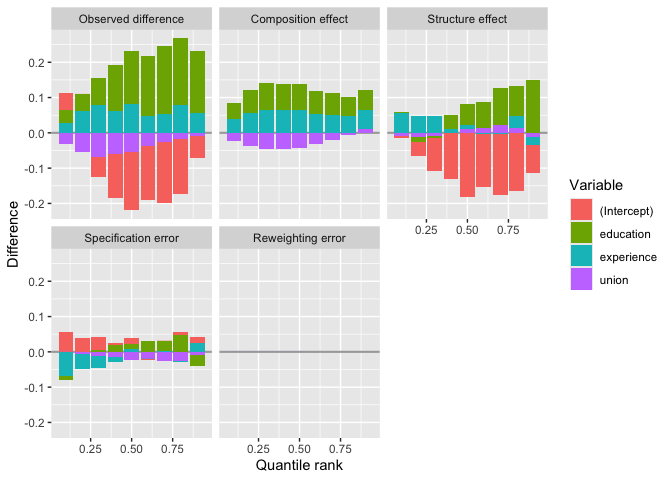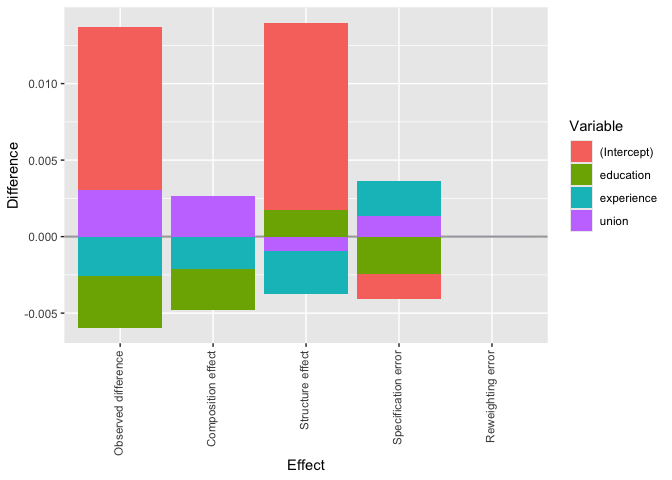 \[\widehat\Delta^\mu_{O,R} = (\widehat \beta_{1,0} - \widehat \beta_{C,0}) + \sum^K_{k=1} (\overline X_{1,k}\widehat \beta_{1,k} - \overline X_{C,k}\widehat \beta_{C,k}) + \sum^K_{k=1} (\overline X_{C,k}\beta_{C,k} - \overline X_{0,k}\widehat \beta_{0,k}) = \widehat\Delta^\mu_{S,R} + \widehat\Delta^\mu_{X,R}.\] These decomposition terms can be further decomposed into a structure and into a composition effect, respectively. This separates the errors from reweighting \(\widehat\Delta^\mu_{S,e}\) and the linear specification \(\widehat\Delta^\mu_{X,e}\), respectively, and yields a “pure” composition effect \(\widehat\Delta^\mu_{X,p}\) and a “pure” structure effect \(\widehat\Delta^\mu_{S,p}\) for each covariate.