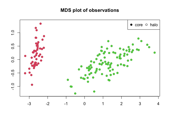 Two types of plots are supported by this package, and both mimics the types of plots used in the publication for the algorithm. The standard plot function produces a decision plot, with optional colouring of cluster peaks if these are assigned. Furthermore plotMDS() performs a multidimensional scaling of the distance matrix and plots this as a scatterplot. If clusters are assigned observations are coloured according to their assignment.