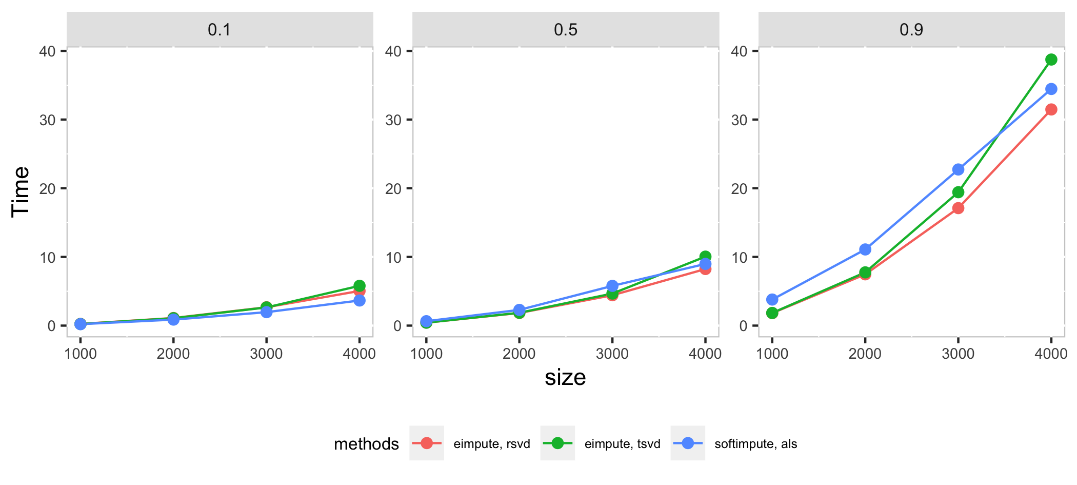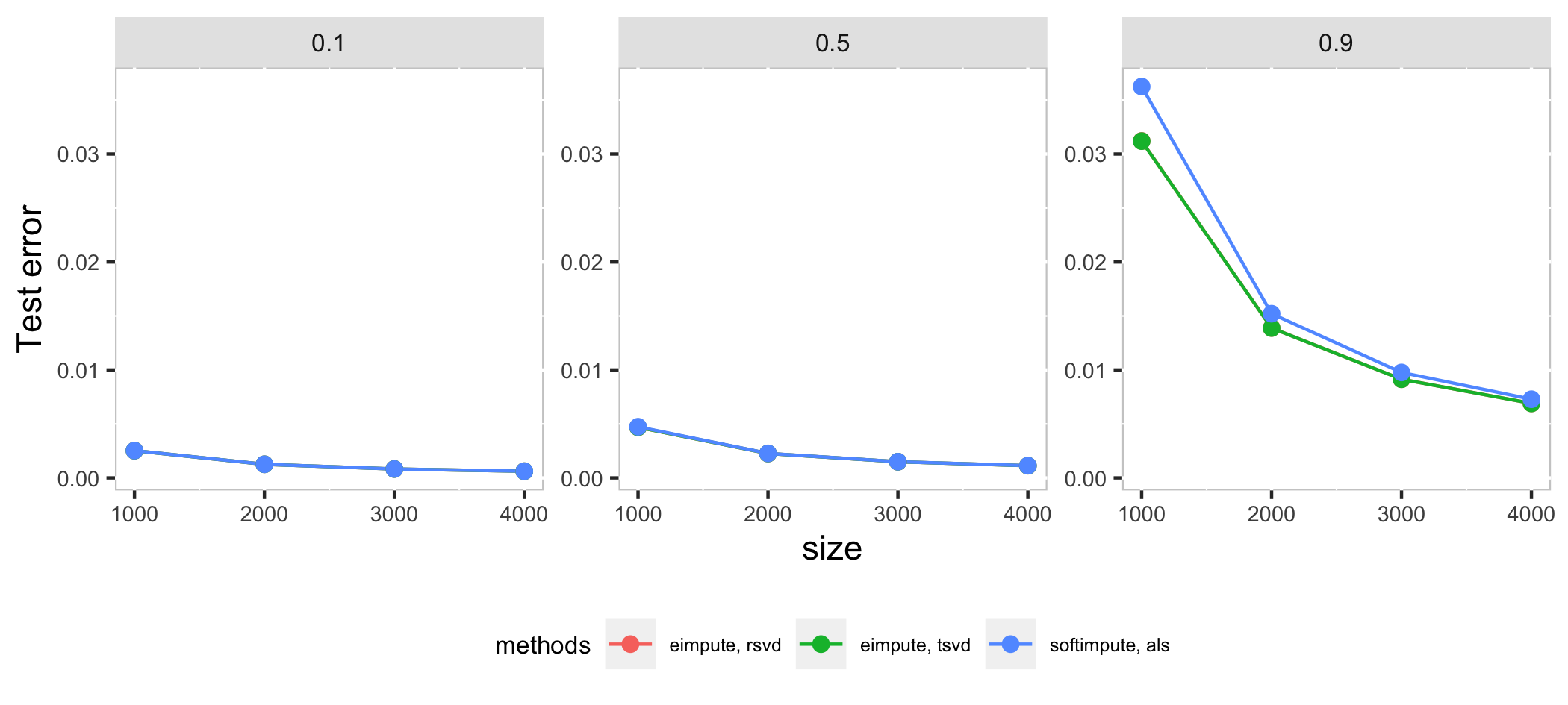 In high dimension case, als method in softimpute is a little faster than eimpute in low proportion of missing observations, as the proportion of missing observations increase, rsvd method in eimpute have a better performance than softimpute in time cost and test error. Compare with two method in **eimpute*, rsvd method is better than tsvd in time cost.