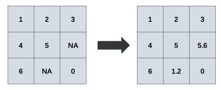 Matrix completion is a procedure for imputing the missing elements in matrices by using the information of observed elements. This procedure can be visualized as: