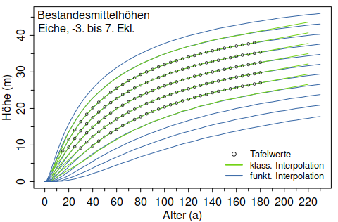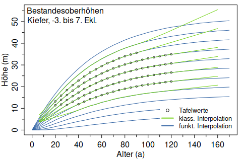 Die Bonitierung von Beständen erfolgt mit et_bonitaet() anhand von Bestandesalter und -höhe standardmäßig über funktionale Bonitätsfächer. Auf Wunsch ist auch die klassische Bonitierung mittels Dreisatz verfügbar. Im Fall der Interpolation zwischen den Tafelwerten unterscheiden sich die Verfahren kaum, aber im Extrapolationsbereich können die Abweichungen durchaus beachtlich sein (siehe Abbildung oben).