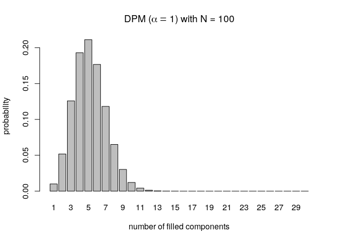 Here, we demonstrate how one can obtain the prior distribution of filled mixture components for the DPM under a specific setting (the concentration parameter (= 1) and when the sample size (N = 100)).