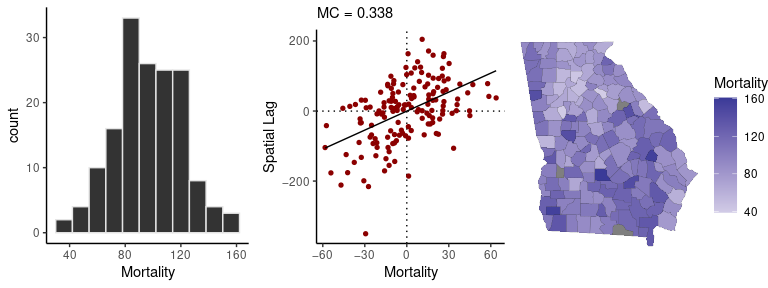 spatial data, including a histogram, Moran scatter plot, and map. The