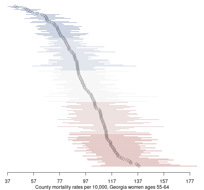 mtext('County mortality rates per 10,000, Georgia women ages 55-64', side = 3, font = 2)