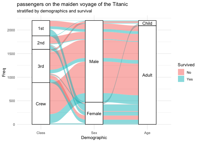 Here is how to generate an alluvial plot representation of the multi-dimensional categorical dataset of passengers on the Titanic: