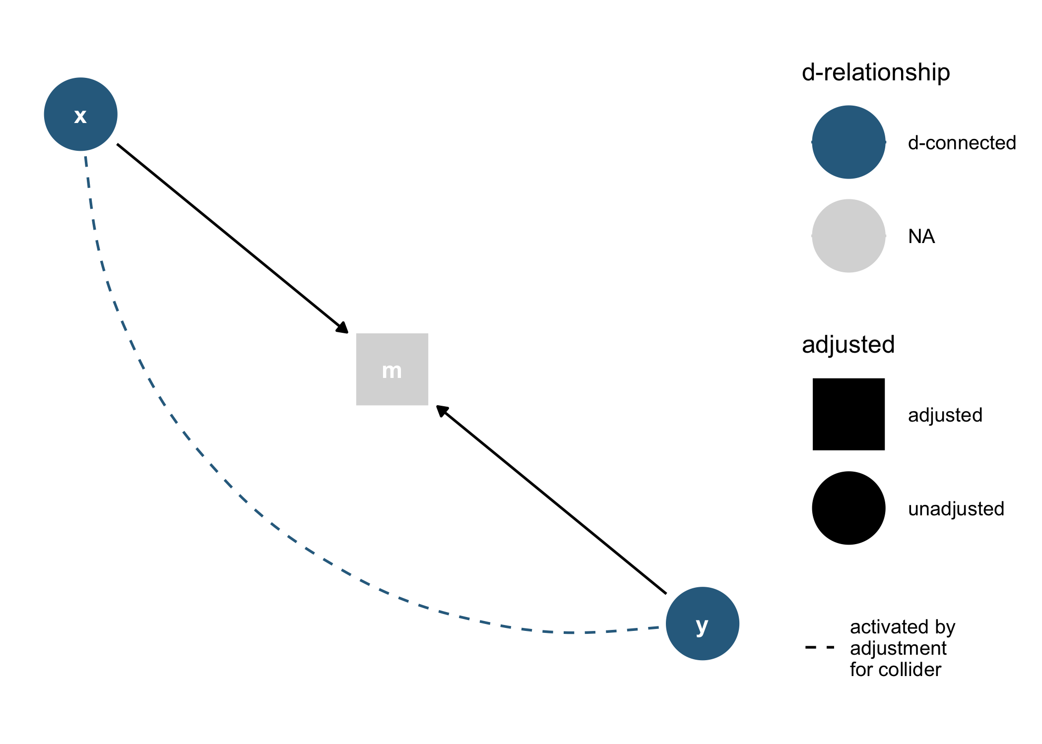 node_dconnected("x", "y", controlling_for = "m") %>%