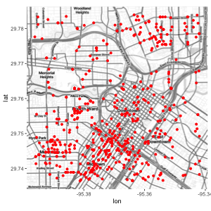 # 2 houston, texas waco, texas 295091 295. 183. 10054 168. 2.79 drivingA few years ago Google has changed its API requirements, and ggmap users are now required to register with Google. From a user’s perspective, there are essentially three ramifications of this:
