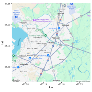 (map <- get_googlemap("waco texas", zoom = 12))