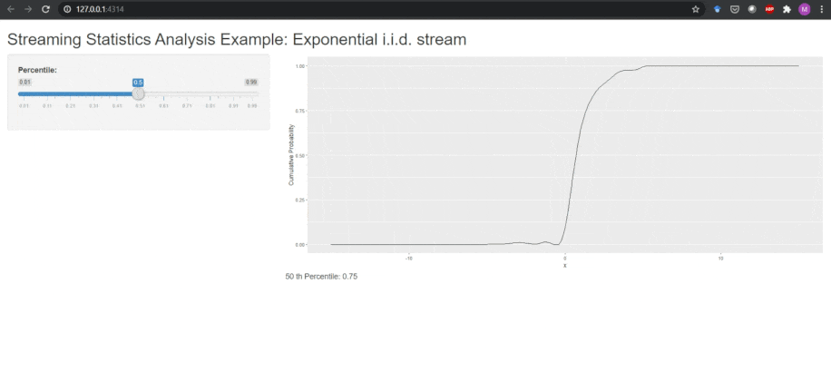 Another useful application of the hermite_estimator class is to obtain pdf, cdf and quantile function estimates on streaming data. The speed of estimation allows the pdf, cdf and quantile functions to be estimated in real time. We illustrate this below for cdf and quantile estimation with a sample Shiny application. We reiterate that the particular usefulness is that the full pdf, cdf and quantile functions are updated in real time. Thus, any arbitrary quantile can be evaluated at any point in time. We include a stub for reading streaming data that generates micro-batches of standard exponential i.i.d. random data. This stub can easily be swapped out for a method reading micro-batches from a Kafka topic or similar.