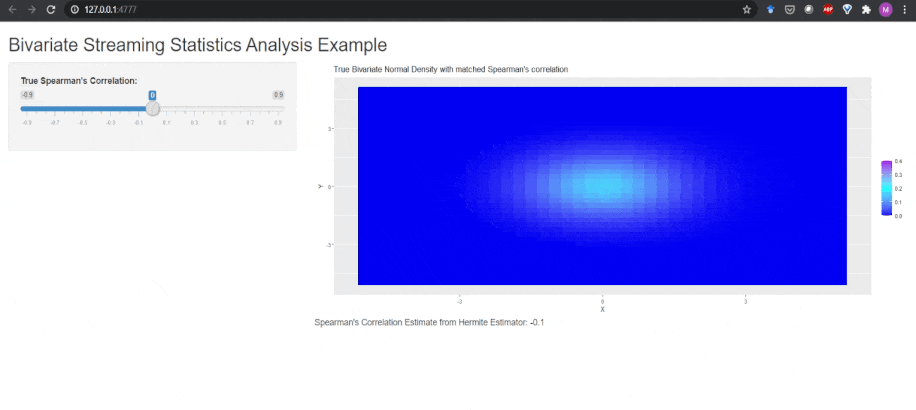 We illustrate tracking a non-stationary bivariate data stream with another sample Shiny application. The bivariate Hermite estimator leverages an exponential weighting scheme as described in the univariate case and does not need to maintain a sliding window. We include a stub for reading streaming data that generates micro-batches of bivariate normal i.i.d. random data with a chosen Spearman’s correlation coefficient (as this is easily linked to the standard correlation matrix). This stub can again be readily swapped out for a method reading micro-batches from a Kafka topic or similar.