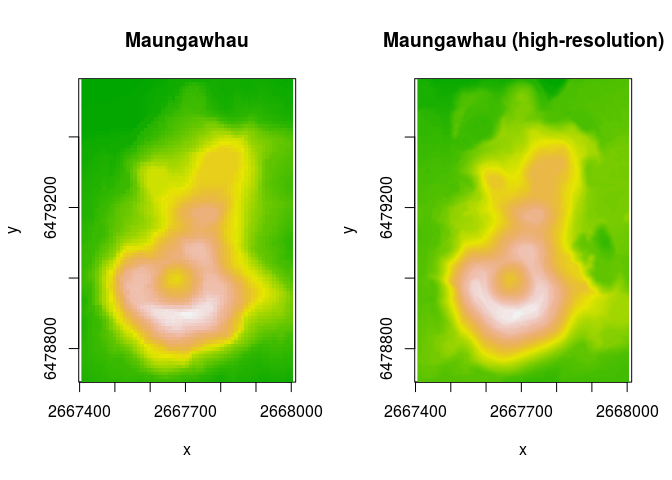 image(maungawhau_hr, asp = 1, main = "Maungawhau (high-resolution)", col = terrain.colors(100))