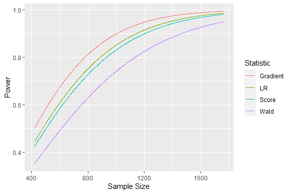 #> Method: AnalyticalHere we see that the gradient statistic would be the most efficient to test our hypothesis: We would need a sample size of 778 to reach our desired power.