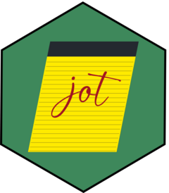 remotes::install_github('christopherkenny/jot')The normal workflow with jot is two staged, first is creating notes and second is reading them.