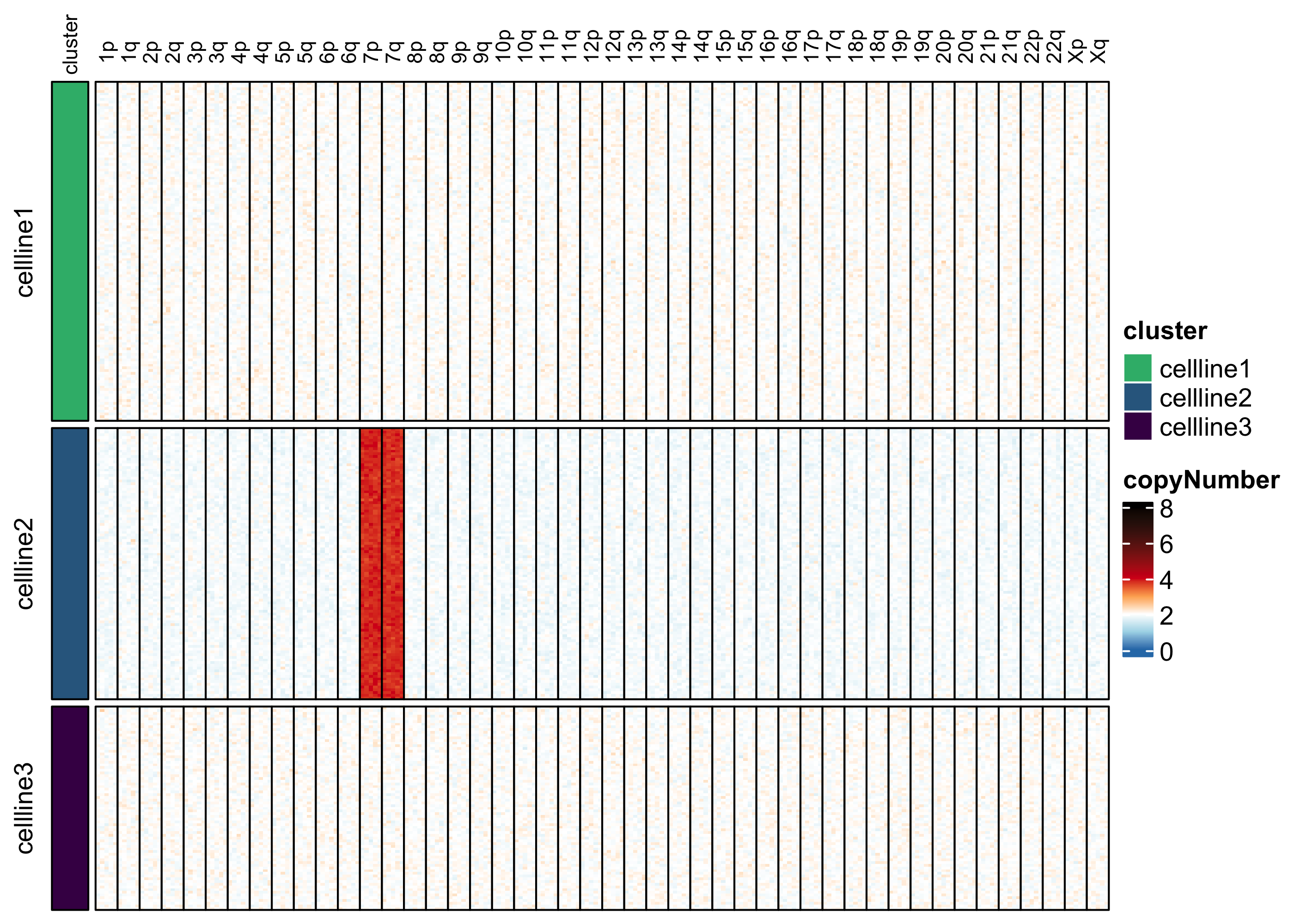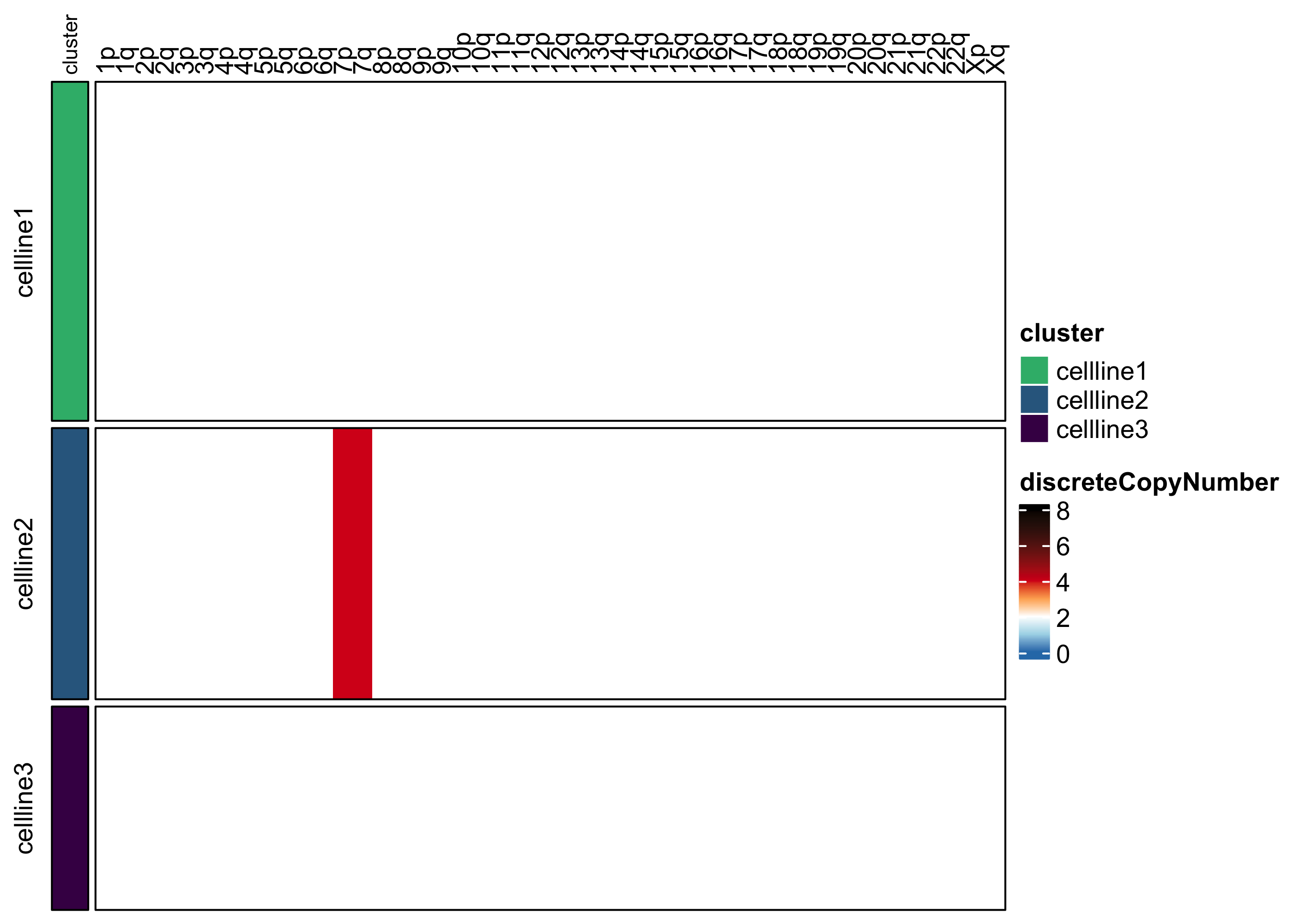 #> Visualize copy number. Visualization reveals that cell line 1 has 1 copy of chromosome arm 1p, and cell line 2 has three copies of chromosome 7.