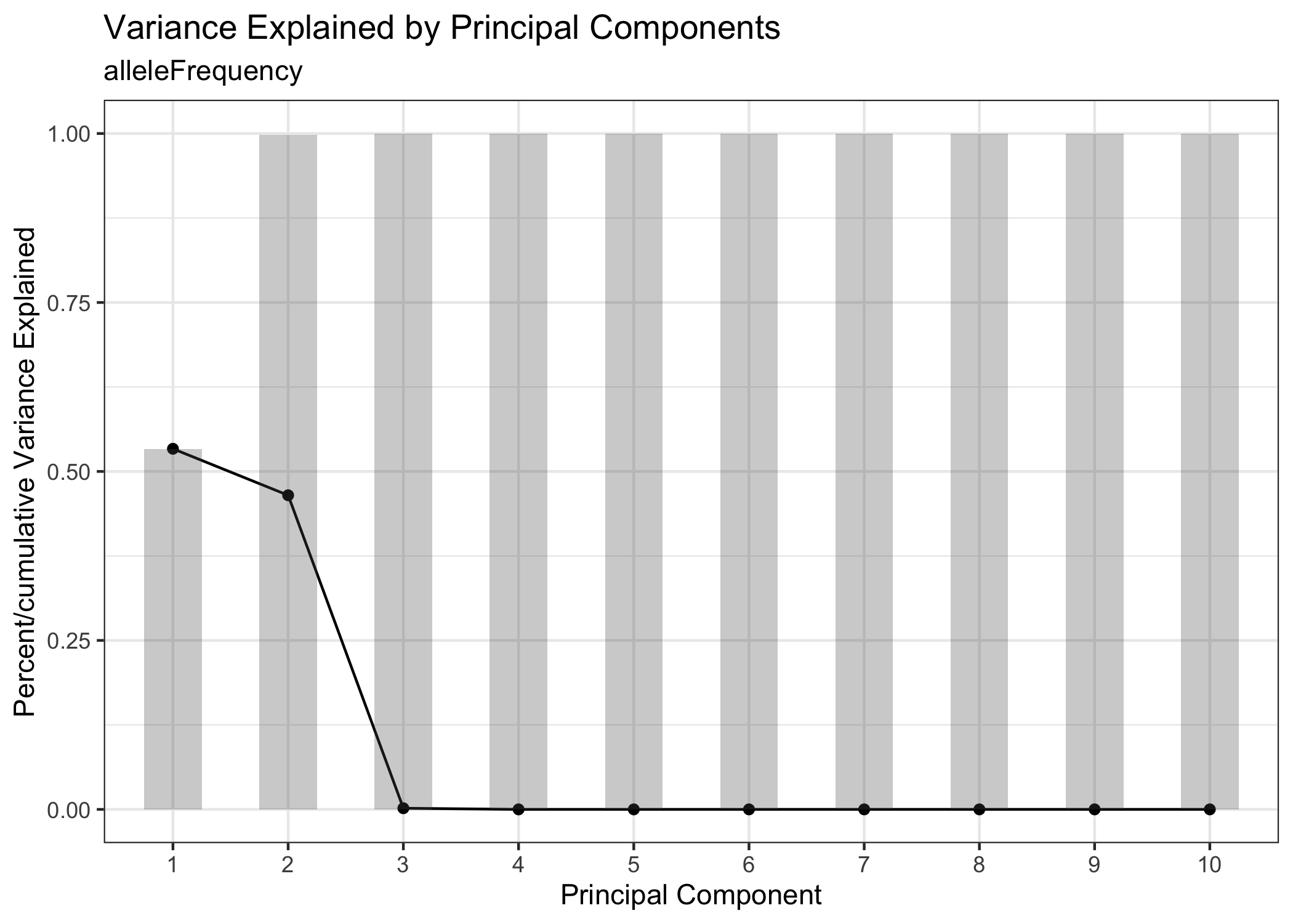 #> gmmParams(0):We cluster on allele frequency to partition different cell lines represented in the experiment. First, run PCA and use the knee plot to identify the PCs accounting for the most variation in the dataset.