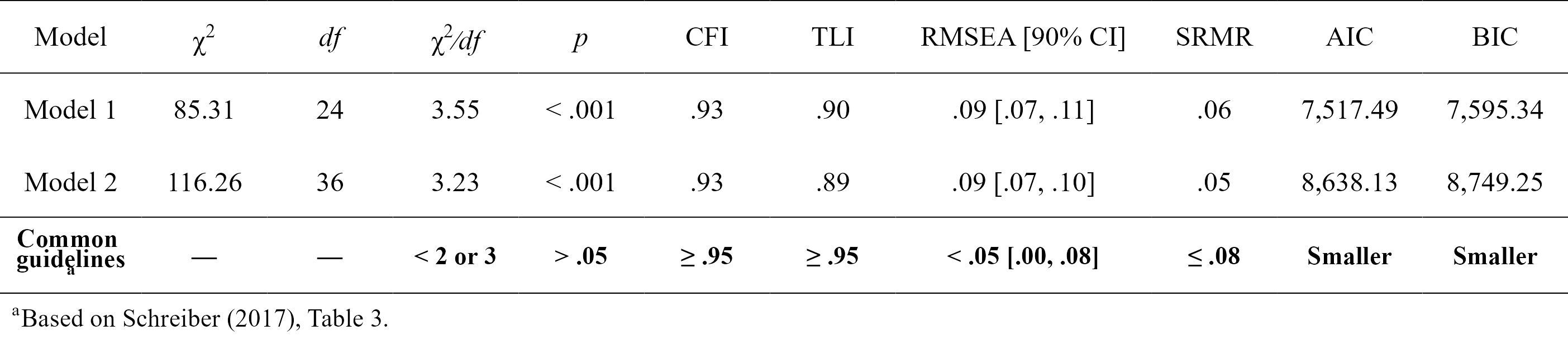 fit_table <- nice_fit(list(fit.cfa, fit.sem), nice_table = TRUE)