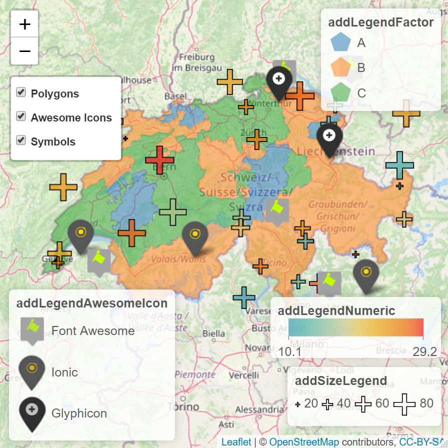addLayersControl(overlayGroups = c('Polygons', 'Awesome Icons', 'Symbols'),