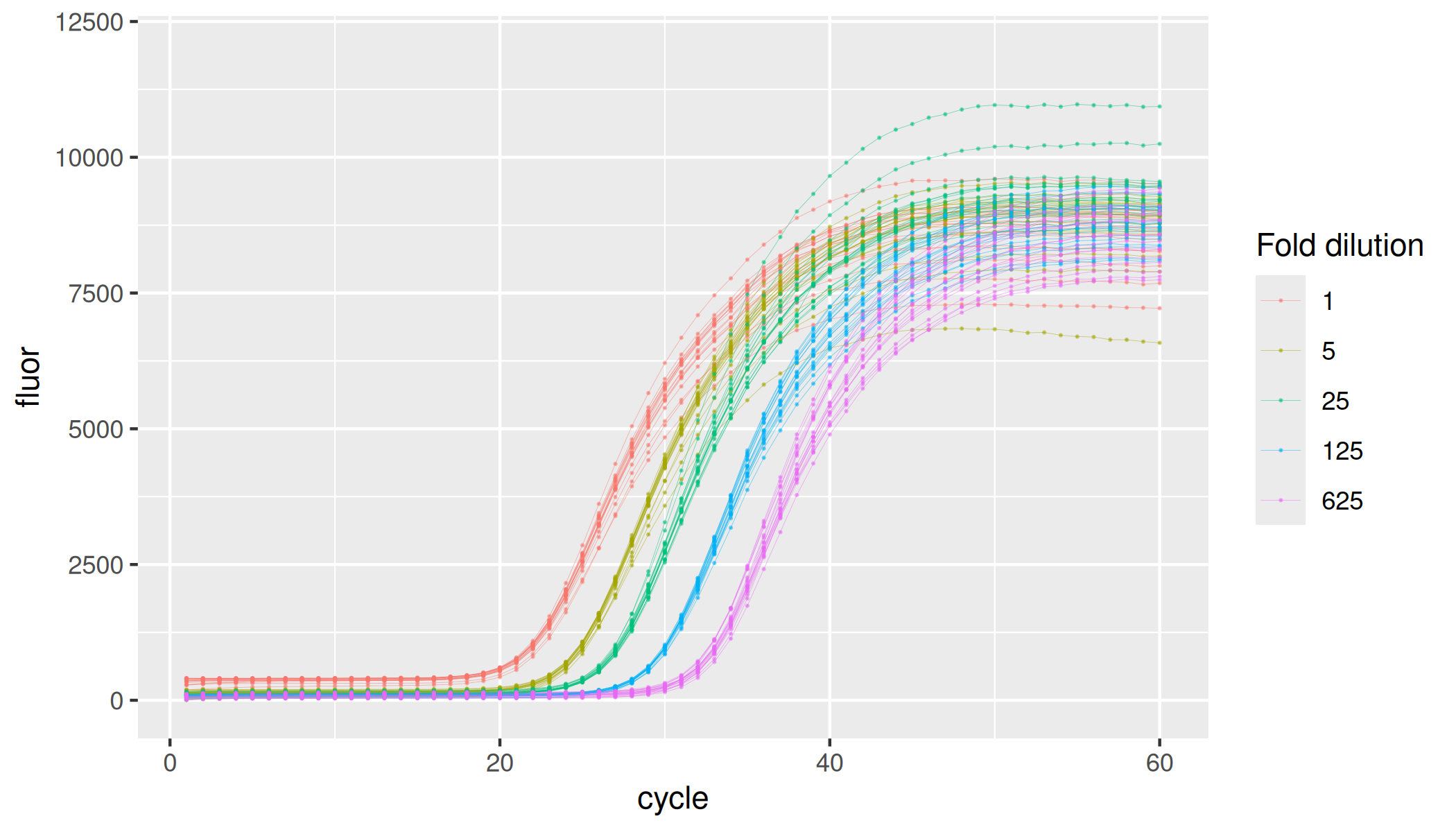 ggplot(aes(x = cycle, y = fluor, group = interaction(plate, inhibitor, dilution, replicate), col = as.factor(dilution))) +